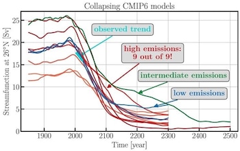 En las nueve simulaciones de altas emisiones, los modelos evolucionan hacia un estado de circulación débil y superficial, con la interrupción del vuelco profundo; este resultado también se produce en algunas simulaciones de emisiones intermedias y bajas. En todos los casos, este cambio se produce tras un colapso a mediados de siglo de la convección profunda en los mares del Atlántico Norte.