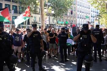 Desde las 16:30 horas, un grupo de manifestantes se encuentra esperando la llegada del pelotón en Cibeles, donde ha tenido lugar una de las primeras intervenciones policiales de la tarde, en la que los agentes han separado a dos grupos de manifestantes propalestinos y proisraelíes.