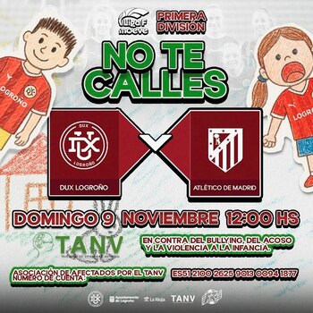 Desde el DUX Logroño "queremos que el partido contra un equipo tan importante y con tanto historial dentro de la máxima categoría del fútbol femenino como es el Atlético de Madrid, sea una fiesta en homenaje en a nuestros jóvenes, por eso vamos a invitar a todos los colegios de La Rioja y a todos los clubes de fútbol de nuestra comunidad autónoma a que acudan de forma gratuita al encuentro contra un equipo de Champions que vamos a jugar el próximo día 9 de noviembre a partir de las 12,00 horas contra el Atlético de Madrid".