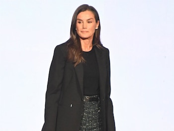 Y demostrando que no hay dos sin tres, su Majestad ha arrasado con un estilismo versátil, sofisticado y de máxima tendencia haciendo un 'mix match' de básicos que deberían formar parte de todo fondo de armario que se precie: Una blazer negra de líneas depuradas y corte entallado, un suéter de punto fino y cuello redondo también en negro, botines de tacón sensato al tono, y la estrella del look, un precioso pantalón de tweed de talle alto y pernera ancha en gris muy oscuro jaspeado con blanco. Un diseño de la firma Maje que estrenó en la celebración del 60 cumpleaños de la infanta Elena el 20 de diciembre de 2023 -en el que se reencontró con el Rey Juan Carlos- y que estábamos deseando que recuperase. En esta ocasión ha añadido además un cinturón estrecho para realzar su silueta.