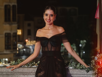 El medio detalló que los complementos se seleccionaron para realzar el vestido sin competir por protagonismo. Majada optó por zapatos de la firma Lodi, modelo Zowa-Te en raso y adornados con un detalle joya en el empeine, así como pendientes Reata de Acus Complementos, diseñados en espiral y con un brillo discreto pensado para aportar luminosidad al rostro. Estos elementos se integraron en la propuesta estética para mantener el equilibrio entre distinción y sencillez.