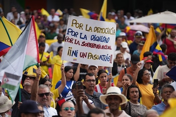 Asimismo, algunos afiches, impresos de forma artesanal y otros producidos por organizaciones políticas, mezclaban consignas de respaldo al Gobierno con críticas a Estados Unidos y alusiones a una supuesta injerencia extranjera, mientras banderas rojas y tricolores se agitaban frente a la fachada de piedra de la Catedral Primada.