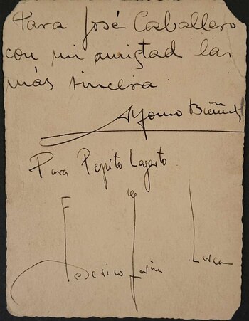 La amistad entre Caballero y Lorca queda reflejada en el archivo visual y epistolar presentado en la sala. Entre los documentos se incluyen imágenes compartidas en Madrid el 29 de junio de 1936, durante las festividades de la verbena de San Juan en la Glorieta de Atocha. También aparece un retrato enviado por Lorca al pintor, junto a cartas en las que el poeta emplea apodos afectuosos como "Pepito Caballero" o "Pepito Lagarto", reflejando el ambiente cercano y humorístico de su círculo creativo. El propio Caballero realizó, años más tarde, en 1974, una serie de dibujos a tinta dedicados a la memoria de Lorca, asesinado durante la Guerra Civil, con elementos como manchas de tinta roja y versos del célebre 'Llanto por Ignacio Sánchez Mejías', todos ellos integrados en la colección expuesta.