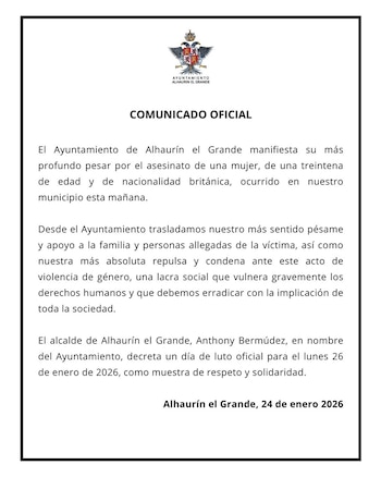 En la mañana del sábado, el sistema de emergencias 112 de Andalucía recibió varias llamadas que alertaban sobre gritos provenientes de una vivienda en la calle Tomillo, zona de La Paca, en Alhaurín el Grande. De acuerdo con la información aportada por el propio 112 y recogida por medios locales, uno de los alertantes indicó que, al entrar en la vivienda, halló a una mujer ensangrentada en el suelo junto a un cuchillo. Ante esta situación, el Ayuntamiento de Alhaurín el Grande comunicó la convocatoria de un día de luto oficial para el lunes 26 de enero, así como una concentración ciudadana y un minuto de silencio en la plaza consistorial como muestra de solidaridad y condena ante este presunto caso de violencia de género.
