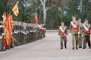 Antes de eso, el Rey ha pasado revista a la tropa y ha saludado a las autoridades bajo vítores del público de 'Viva el Rey' y 'Viva España'. Después han jurado la bandera, en pase de a uno y a tres;que ha dado paso al discurso del coronel jefe del Cefot, Álvaro Kromer, ha pronunciado unas palabras en las que ha agradecido al Rey el "enorme honor" que ha brindado con su presencia, que supone un parangón que "no olvidaremos jamás".