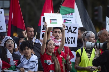 Unas 1.000 personas, según datos de la Delegación del Gobierno, se han manifestado este domingo en Madrid para denunciar que "el genocidio continúa" en Palestina y para pedir el embargo integral de armas a Israel y la ruptura por parte del Gobierno de cualquier tipo de relación con Israel.