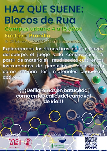 Los participantes de entre 4 y 15 años tendrán la oportunidad de fabricar instrumentos de percusión con materiales reciclados, como latas, cartón, tubos y tapones, y experimentar cómo suenan al ser activados y construidos colectivamente. Esta actividad, que fusiona la creatividad y el trabajo grupal, forma parte del campus "Haz que suene: Blocos de Rua", que se desarrollará del 16 al 20 de febrero en Enclave Pronillo. Según informó la Fundación Santander Creativa (FSC), la propuesta invita a los niños y jóvenes a explorar la música brasileña mediante dinámicas lúdicas, juegos colaborativos e improvisación, sin necesidad de experiencia previa.