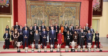 Los futbolistas Rodrigo Hernández y Aitana Bonmatí y los marchadores Álvaro Martín y María Pérez recibieron este miércoles los Premios Nacionales del Deporte de 2023 y 2024, respectivamente, en una ceremonia presidida por SS. MM. los Reyes en el Palacio Real de El Pardo (Madrid) y por la ministra de Educación, Formación Profesional y Deportes, Milagros Tolón.