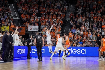 Y entonces llegó la implosión. Hezonja respondió casi sin pestañear con otro triple, el Valencia perdió el balón en el saque de fondo cuando tenía la final en la mano y el croata, desde su esquina favorita, castigó de nuevo para poner el 106-107 a 8.3 segundos. Montero falló la última penetración entre protestas y Campazzo selló desde el tiro libre el 106-108 definitivo. Del cielo al abismo en veinte segundos, del +5 a la eliminación, mientras 'SuperMario' silenciaba un pabellón que ya se veía celebrando y el Real Madrid, eterno e indomable, se citaba con su 54ª final para seguir persiguiendo su 30º título copero.