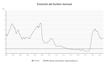 Una persona con una hipoteca variable de 150.000 euros a 30 años y un diferencial del 0,99% más Euríbor, al revisar su préstamo con el valor de febrero del índice, obtendría una reducción en su cuota mensual de 15,37 euros si la revisión es anual. Esta modificación representa un ahorro de aproximadamente 184,4 euros al año. Según consignó Europa Press, este descenso en la cuota se debe a que el Euríbor cerró febrero en el 2,221%, cifra que es inferior al 2,245% registrado en enero y que marca la segunda caída consecutiva del índice.