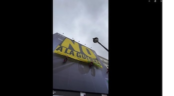 La organizacion ecologista Greenpeace ha desplegado una gran pancarta en la Puerta del Sol en la que se puede leer 'No a la guerra', según recoge un video colgado en su perfil de Instagram en el que se puede ver a varios activistas descolgados en una de las fachadas de las que se ha desplegado el cartel.