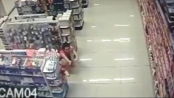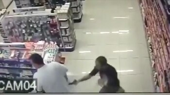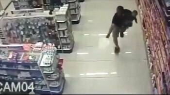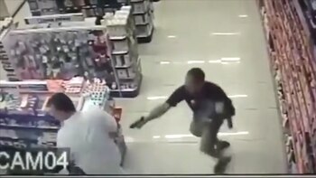 En las imágenes captadas por la cámara de seguridad se ve cómo después de los primeros disparos le entrega el niño a la mujer, quien grita antes de refugiarse detrás de las estanterías.