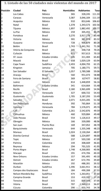 "Con una tasa de 111,33 homicidios por cada 100.000 habitantes, en 2017 la mexicana Los Cabos (en el noroccidental estado de Baja California Sur) fue la ciudad más violenta del mundo e ingresó por primera vez al ránking", indicó el Consejo Ciudadano para la Seguridad Pública y la Justicia Penal.