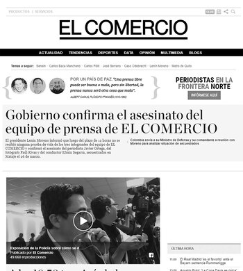 "El gobierno confirma el asesinato del equipo de prensa de EL COMERCIO", dice el titular principal del sitio online del diario ecuatoriano, en referencia al homicidio del periodista Javier Ortega, de 36 años; el fotógrafo Paúl Rivas, de 45, y el conductor Efraín Segarra, de 60, que habían sido secuestrados el 26 de marzo en la zona de Mataje, en la provincia de Esmeraldas (noroeste), donde recababan información sobre los ataques registrados en esa región desde enero.