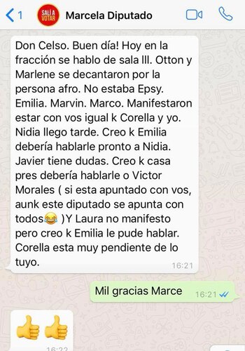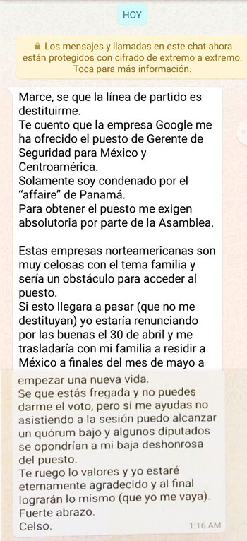 "Se que estás fregada y no puedes darme el voto, pero si me ayudas no asistiendo a la sesión puedo alcanzar un quorum bajo y algunos diputados se opondrían a mi baja deshonrosa del puesto. Te ruego lo valores y yo estaré eternamente agradecido y al final lograrán lo mismo (que yo me vaya) Fuerte abrazo. Celso" es parte del mensaje.