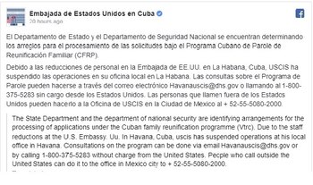 El Departamento de Estado y el Departamento de Seguridad Nacional de Estados Unidos "están determinando las disposiciones para el procesamiento de solicitudes bajo el Programa Cubano de Reunificación Familiar (CFRP)", publicó este lunes en su página web la Embajada de Estados Unidos en Cuba.