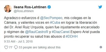 La congresista cubanoamericana Ileana Ros-Lehtinen agradeció al secretario de Estado de EEUU su apoyo a la liberación de Ariel Ruiz Urquiola.