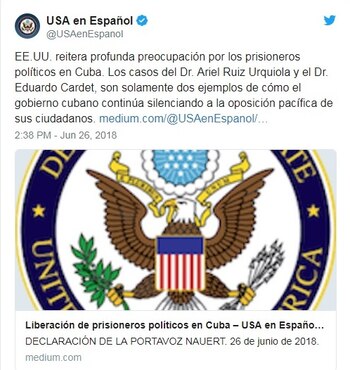 El pasado 26 de junio Estados Unidos instó al gobierno de la isla a poner en libertad a Eduardo Cardet y Ariel Ruiz Urquiola, ambos declarados "prisioneros de conciencia" por Amnistía Internacional.