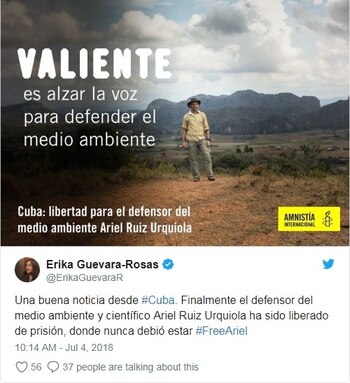 Erika Guevara Rosas, abogada de derechos humanos y Directora para las Américas de Amnistía Internacional, escribió: "Finalmente el defensor del medio ambiente y científico Ariel Ruiz Urquiola ha sido liberado de prisión, donde nunca debió estar".