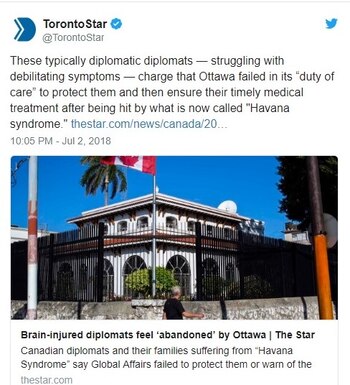 Diplomáticos canadienses que estuvieron acreditados en La Habana se han quejado al diario The Toronto Star de que las autoridades de su país no tomaron precauciones suficientes y oportunas con el personal en Cuba y sus familiares, después de que diplomáticos estadounidenses y los primeros canadienses comenzaran a sufrir lo que ahora se conoce como el "Síndrome de La Habana", secuelas de misteriosos ataques que dañaron la salud de 26 estadounidenses y al menos 10 canadienses en la capital cubana desde noviembre de 2016.