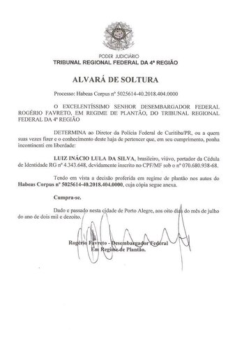 No obstante, Favreto, tras los fallos de Moro y Neto, reiteró su decisión y ordenó la liberación del ex presidente de Brasil. "Reitero el contenido de las decisiones anteriores, determinando el inmediato cumplimiento de la medida de liberación en el plazo máximo de una hora", escribió después de las 16, hora local, el juez de la TRF4.