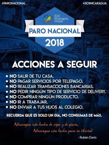 Asimismo, instó a todos los nicaragüenses que cuestionan "a este régimen dictatorial, sanguinario, corrupto, nepótico y violador de los derechos humanos de la ciudadanía" a participar en ese paro, con el fin de enviar "un mensaje inequívoco mediante el cual la mayoría de la población le dice nuevamente a la familia Ortega-Murillo: qué se vayan".
