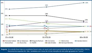 La consultora FSB arrojó un fin de semana antes un apoyo de 26% para Bolsonaro, algunos puntos por encima del promedio de las otras encuestadoras. Según se desprende de la variación registrada, el ex militar sumó apoyos de los indecisos, ya que el sector que respondió "Ninguno" bajó cinco puntos en los últimos días. La encuesta, que consultó a 2.000 votantes, tiene un margen de error de 2 puntos porcentuales.