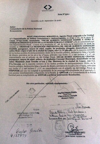 Posteriormente fue trasladado al Palacio de Justicia a donde se presentó ante el juez Humberto Otazú, quien a última hora de la tarde rechazó el pedido de la defensa para la prisión domiciliaria y ordenó la prisión preventiva de González Daher y de su hijo Oscar González Chaves en la Agrupación Especializada de la Policía Nacional.