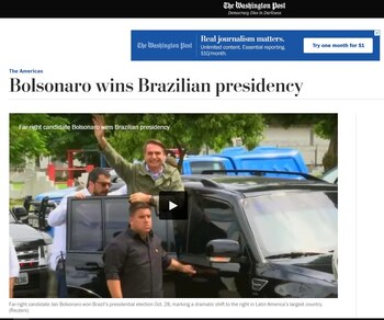 La versión online del diario neoyorquino habla de las elecciones en una nota titulada: "Un populista de derecha fue elegido presidente de Brasil".