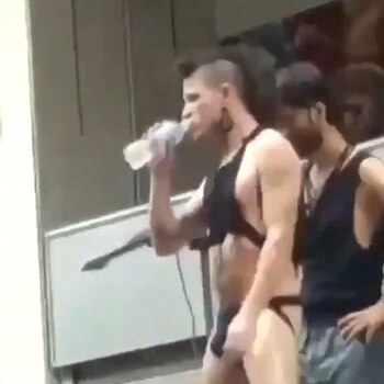 En el video se ve a un hombre que baila en ropa interior, semi desnudo, sobre el techo de una parada de transporte público. Mientras tanto, otro persona que está a su lado le orina la cabeza, al parecer, con su consentimiento.
