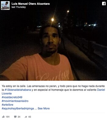 Luis Manuel Otero Alcántara, artista y activista cubano, fue detenido sin causa justificada por la policía hace pocos días. "Ya estoy en la calle", escribió horas más tarde en las redes sociales. "Las amenazas no paran, y todo para que no haga nada durante la XIII Bienal de La Habana", explicó.