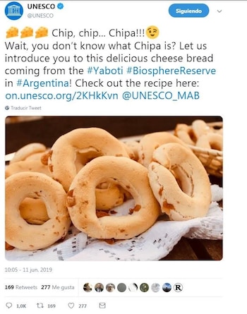 "Chipa es un acompañamiento ideal para el café, o cualquier comida de desayuno. Está hecho de almidón de yuca que es un ingrediente típico de la Reserva de Biosfera Yaboti en Argentina. La harina de yuca es muy versátil para preparar varios platos comunes en la región, incluido este pan con queso. La mejor parte de la chipa es que no solo es deliciosa, sino también sin gluten", señalaba en inglés la cuenta de la UNESCO en las citadas redes sociales.