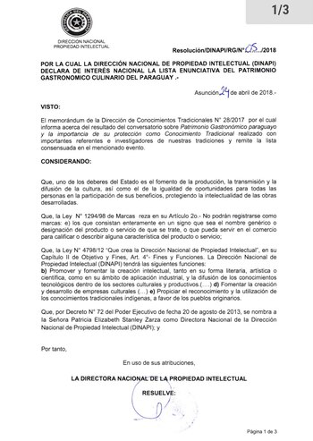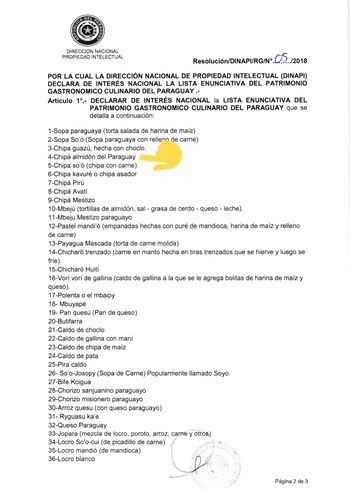 La resolución con la que el chipá fue declarado patrimonio gastronómico del Paraguay