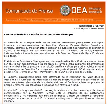 "El Gobierno nicaragüense había sido informado de la realización del viaje", añadió la misión, cuyos siete integrantes fueron designados el 30 de agosto y deben presentar su informe al Consejo Permanente de la OEA en un plazo de 75 días.
