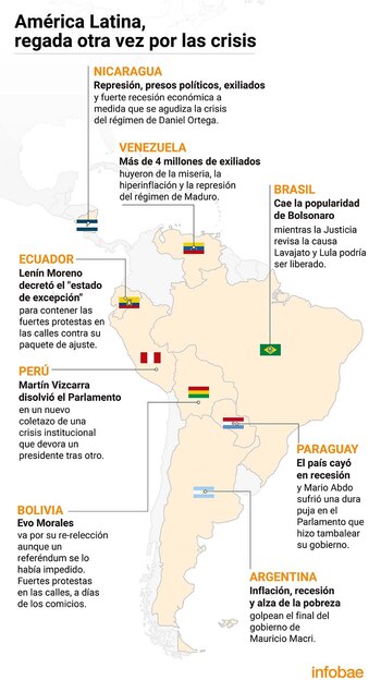 Y esta imprevisibilidad latina llegó para quedarse, generando caos y desequilibrio institucional. Ecuador explotó, Perú está en un limbo y el chavismo se refriega las manos. El ex presidente Rafael Correa se hace el inocente desde Bruselas (donde vive para no presentarse ante la justicia de su país) y dice que no tiene nada que ver con el levantamiento en Quito. Pero por las dudas, ya se postuló para unas elecciones que nunca fueron convocadas. “Si es necesario que sea candidato, lo seré”, dijo el hombre que gobernó Ecuador por diez años con dos reelecciones (2007/2017) y sin que nadie expresara que eso era necesario. Por su parte, Diosdado Cabello, el segundo hombre fuerte del gobierno Venezolano, ya canta victoria. “Estos días ha habido una brisita bolivariana por algunos países, como Ecuador, Perú, Argentina, Colombia, Honduras y Brasil... Una brisita”, dijo con una sonrisa socarrona.