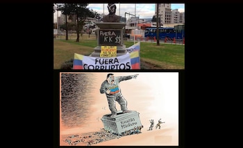 También se podía ver una foto de un monumento al ex presidente argentino Néstor Kirchner vandalizado con tres carteles, uno que decía “fuera KK$$” y otro, “fuera corruptos”; y el último, “a un delincuente no se lo condecora”.