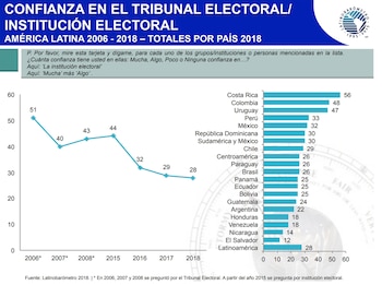 También llegó a su pico en el período la insatisfacción con el funcionamiento de la democracia: 71 por ciento. Los insatisfechos representaban el 51% en 2009, 20 puntos menos. Otro dato preocupante es el declive de la confianza en el órgano de control electoral, lo que supone que se descree del resultado de los comicios. Entre 2006 y 2018 cayó de 51 a 28 por ciento.