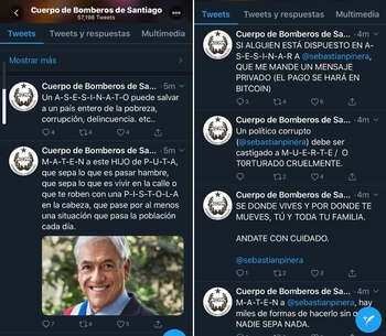 La cuenta oficial del Cuerpo de Bomberos de Santiago de Chile en Twitter fue hackeada este sábado y usada para publicar una serie de amenazas contra el presidente del país, Sebastián Piñera.