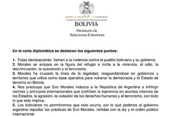 En consecuencia, continúa la carta, el gobierno interino manifiesta su “preocupación” por que Morales “induzca a la República Argentina a infringir normas y principios internacionales que prohíben la injerencia en asuntos internos de los Estados, la agresión, la violación de los derechos humanos y el terrorismo, con todo lo que esto implica”.