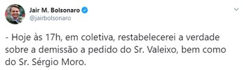 El presidente de Brasil, Jair Bolsonaro, anunció en Twitter que brindará una conferencia de prensa esta tarde para hablar del despido del director de la Policía Federal y la posterior renuncia de Sergio Moro, su ahora ex ministro de Justicia. Será a las 17:00 local (20:00 GMT) para “restablecer la verdad”, según el jefe de Estado.