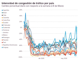 En base a datos recolectados por la popular aplicación de navegación Waze, el Banco Interamericano de Desarrollo (BID) creó una serie de indicadores que muestran qué tanta efectividad han tenido las restricciones a la circulación de las personas en Argentina, Bolivia, Brasil, Chile, Colombia, Costa Rica, Ecuador, El Salvador, Guatemala, Honduras, México, Nicaragua, Panamá, República Dominicana y Uruguay.