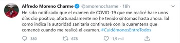 “He sido notificado que el examen de COVID-19 que me realicé hace unos días dio positivo, afortunadamente no he tenido síntomas hasta ahora”, anunció Moreno, el primero de los ministros en comunicar el contagio, en su cuenta de Twitter.