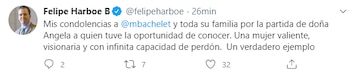 El senador Felipe Harboe, quien fue subsecretario del Interior durante el primer gobierno de Bachelet, envió sus condolencias a la ex jefa de Estado. “Una mujer valiente, visionaria y con infinita capacidad de perdón. Un verdadero ejemplo”.