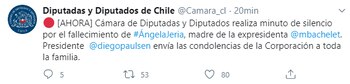 Este mediodía, la Cámara de Diputados de Chile hizo un minuto de silencio por la muerte de la madre de Bachelet. “Cámara de Diputadas y Diputados realiza minuto de silencio por el fallecimiento de Ángela Jeria, madre de la ex presidenta Michelle Bachelet. El presidente Diego Paulsen envía las condolencias de la Corporación a toda la familia”, manifestó el poder legislativo en Twitter.