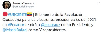 “El binomio de la Revolución Ciudadana para las elecciones presidenciales del 2021 en #Ecuador tendrá a @ecuarauz como Presidente y @MashiRafael como Vicepresidente”, dijo el brasileño Amauri Chamorro, ex asesor comunicacional del gobierno de Correa, a través de su cuenta de Twitter.