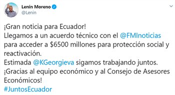 El presidente del país, Lenín Moreno, celebró en Twitter el acuerdo preliminar. “¡Gran noticia para Ecuador! Llegamos a un acuerdo técnico con el FMI para acceder a $6.500 millones para protección social y reactivación”, dijo el mandatario.
