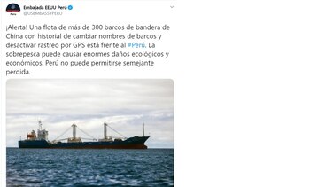 “¡Alerta! Una flota de más de 300 barcos de bandera de China con historial de cambiar nombres de barcos y desactivar rastreo por GPS está frente al Perú. La sobrepesca puede causar enormes daños ecológicos y económicos. Perú no puede permitirse semejante pérdida”, escribió en Twitter la misión diplomática estadounidense.