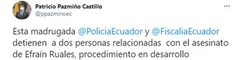 “Esta madrugada, la Policía y Fiscalía detienen a dos personas relacionadas con el asesinato de Efraín Ruales, procedimiento en desarrollo”, escribió este viernes en su cuenta de Twitter el ministro de Gobierno, Patricio Pazmiño.