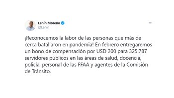 “En febrero entregaremos un bono de compensación por USD 200 para 325.787 servidores públicos”, señaló el mandatario a través de su cuenta en Twitter.