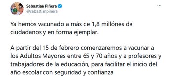 “Ya hemos vacunado a más de 1,8 millones de ciudadanos y en forma ejemplar. A partir del 15 de febrero comenzaremos a vacunar a los adultos mayores entre 65 y 70 años, y a profesores y trabajadores de la educación, para facilitar el inicio del año escolar con seguridad y confianza”, manifestó el presidente, Sebastián Piñera, en Twitter.